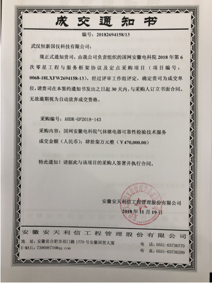 在国网安徽电科院2018年第6次零星工程与服务框架协议及定点采购中,我公司自主研发的“气体继电器校验装置”再次受到国内最高权威机构的肯定,在“气体继电器可靠性检验技术服务”项目中一举中标。